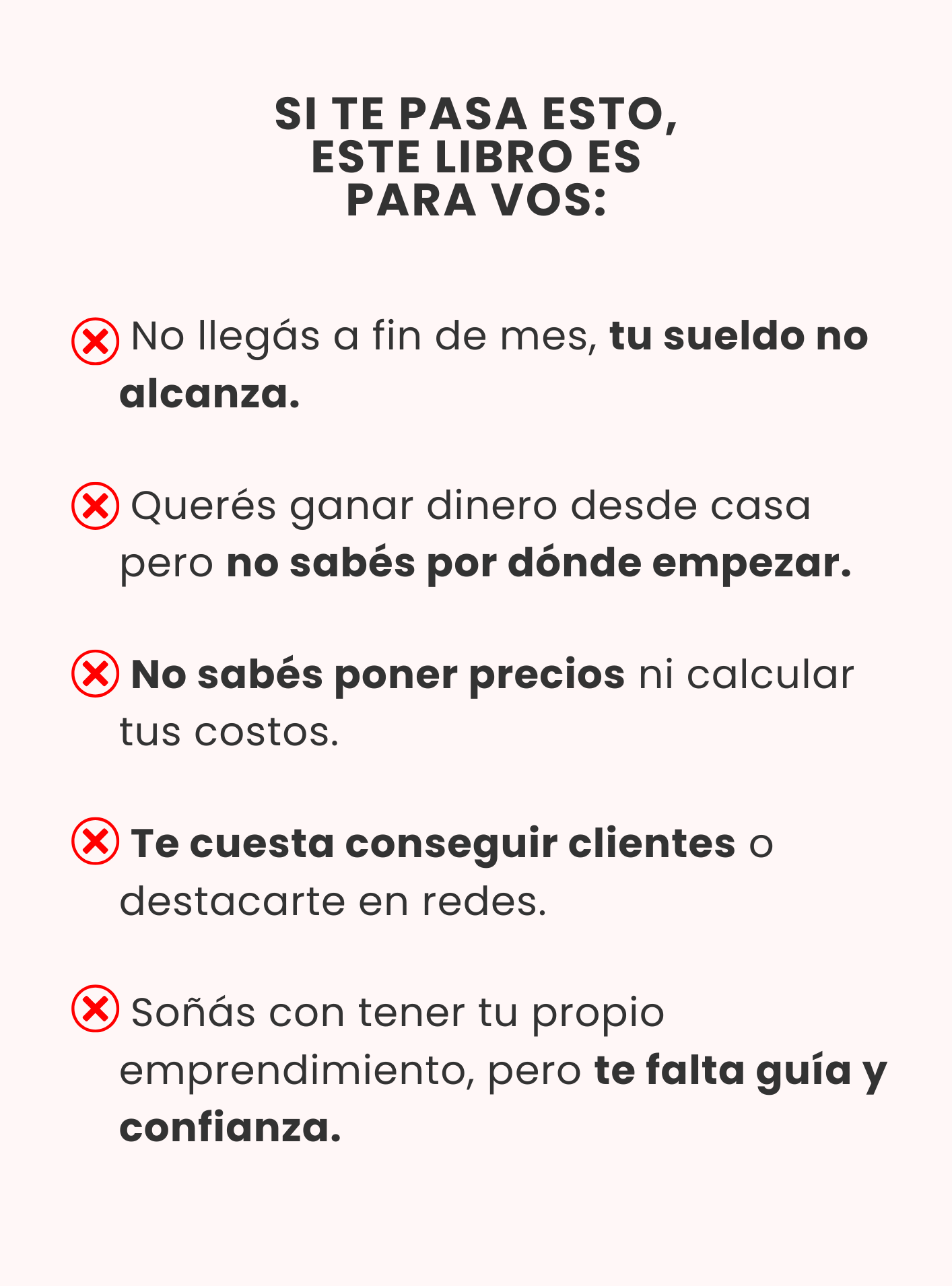 "Lo compré sin saber si me iba a servir y hoy tengo mis primeras clientas fijas. El ebook me dio estructura y confianza para arrancar, ¡valió cada peso!"